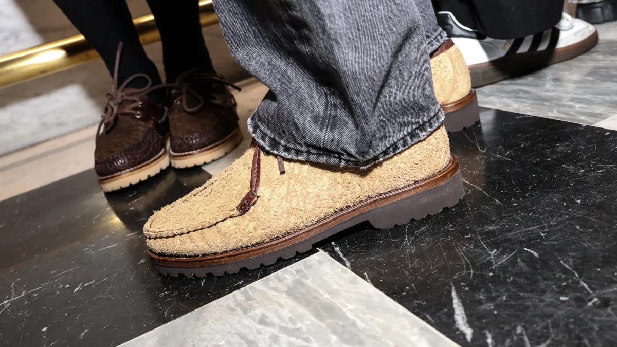 A Wales Bonner, em parceria com a Adidas, apresentou uma nova iteração do Superstar feita de couro branco em um padrão exótico com relevo - imitando couro de crocodilo. Faz sentido, dadas as inspirações originais envolvendo o hip-hop na coleção, e a influência de MCs e produtores como Rashad “Ringo” Smith e Yasiin Bey, que contribuíram para a trilha sonora do desfile.