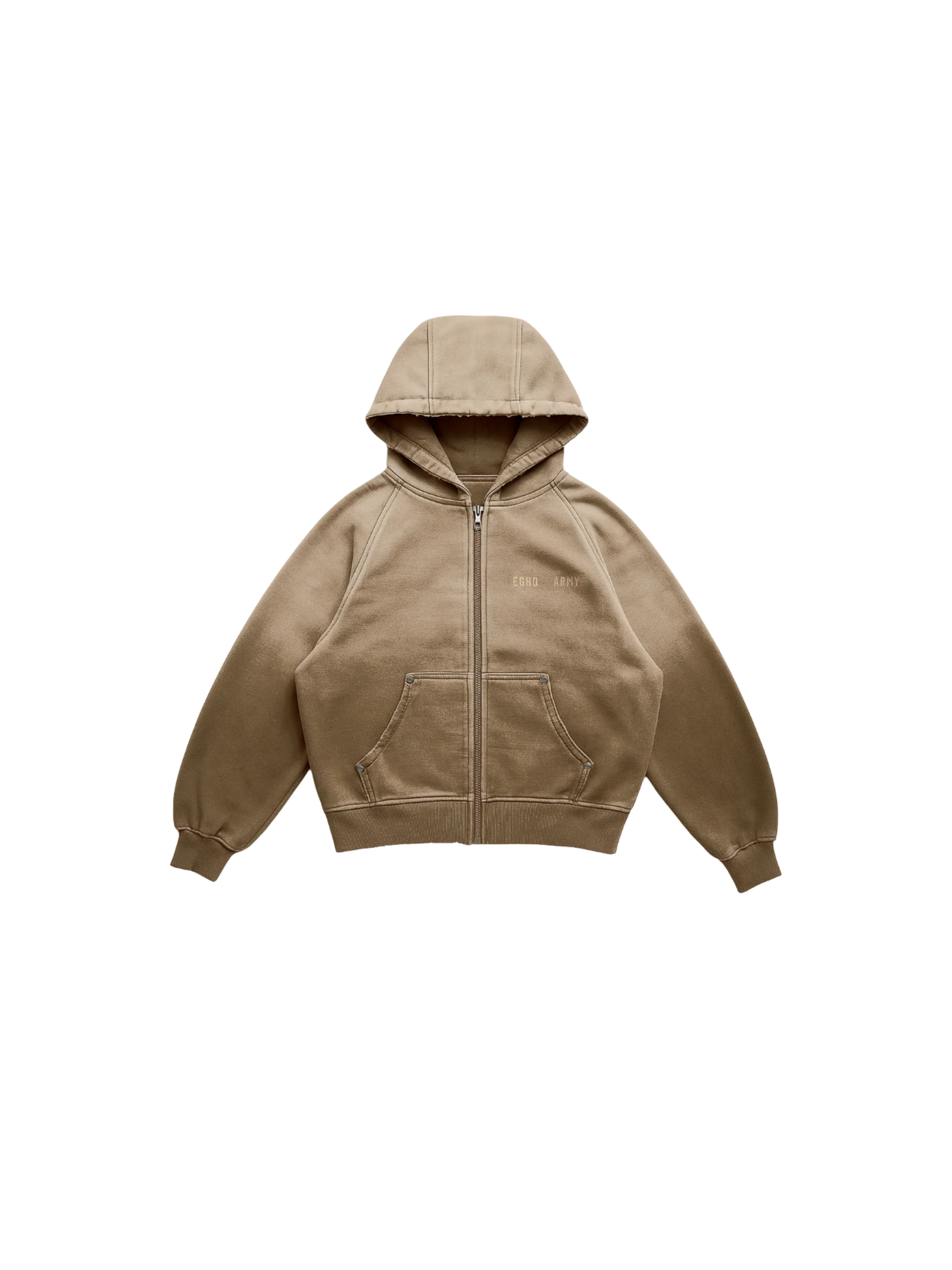 Modelagem raglan boxy, capuz duplo estruturado e fechamento frontal por zíper metálico.